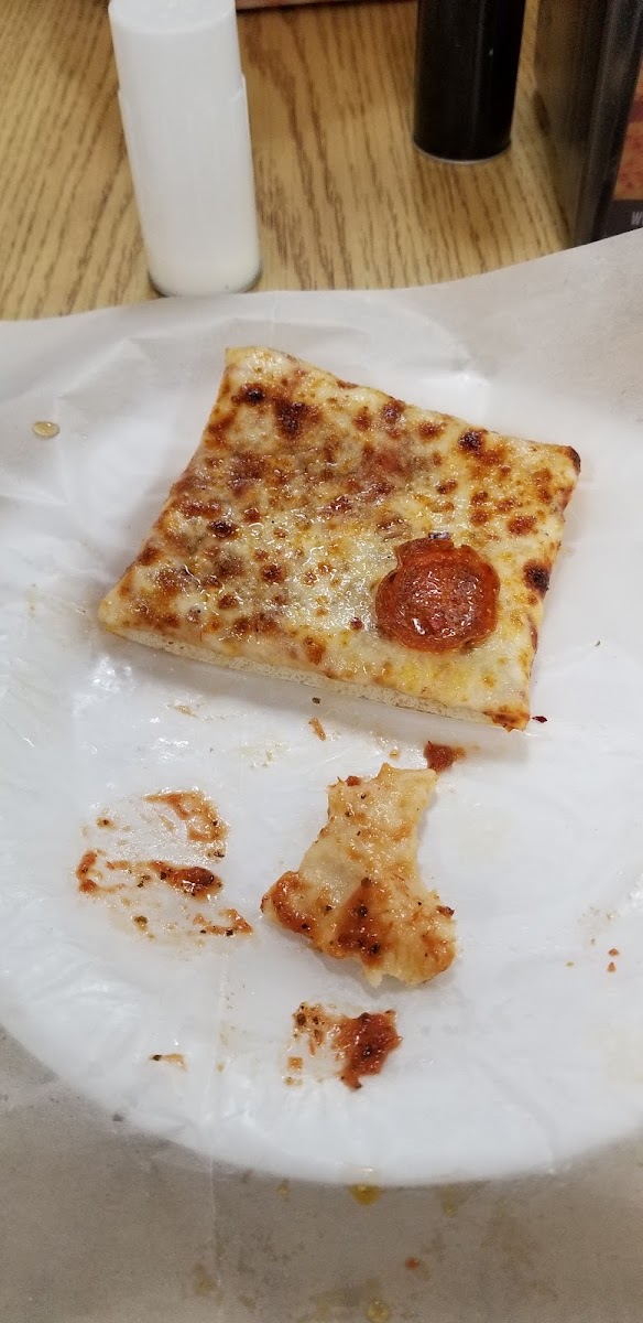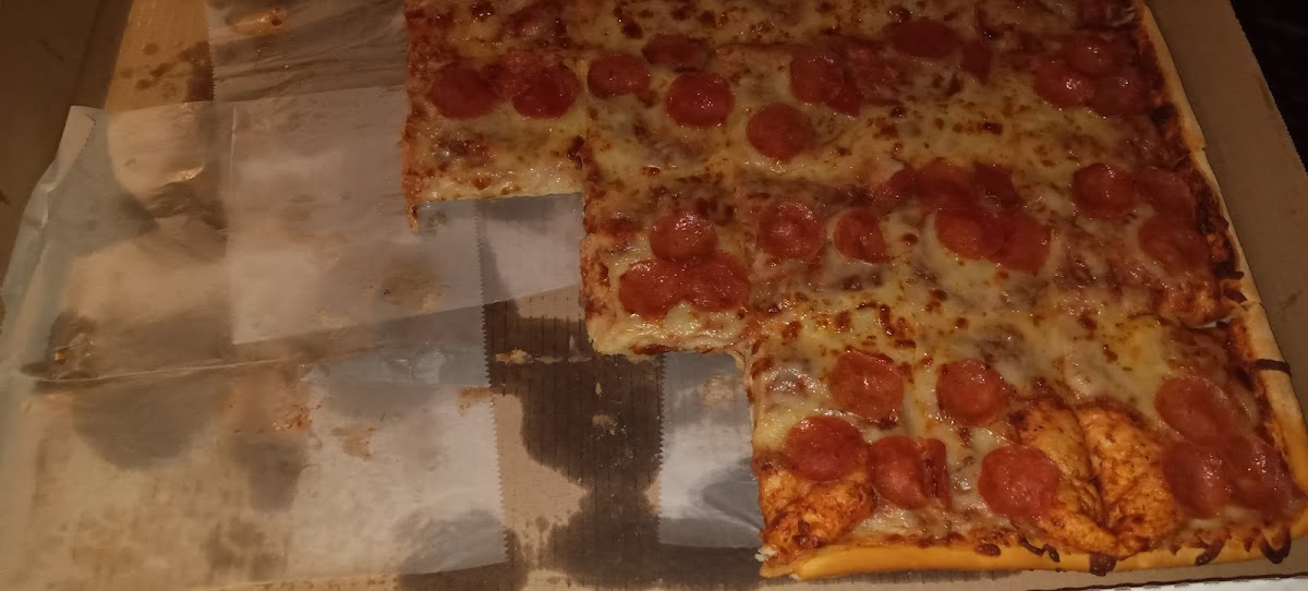 We each got a slice! Excellent pizza would highly recommend!! We'll definitely be back!! Sorry no pics at this time it was hot and cheesy and the crust was perfect we just dug in and ate! Went back today got a 14 inch pepperoni square pie it was hot, cheesy and delicious, definitely worth the trip!